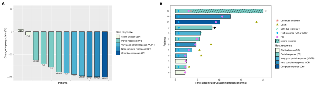 从2017年11月到2020年8月,在德国的学术MM中心共招募12例患者。所有患者均接受了多种疗法,既往治疗的中位线数为5(范围2~14)。所有患者均对蛋白酶体抑制剂(PIs)治疗无效,11/12(92%)例患者对免疫调节剂(IMiDs)治疗无效,4/12(33%)例患者对抗CD38抗体治疗无效。