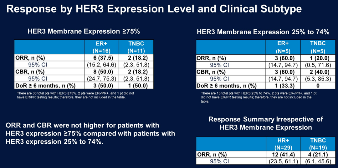 HR+患者和TNBC患者的ORR分别为41.4%和21.1%,且在不同HER3表达水平患者均展现疗效:HR+患者中,HER3≥75%、HER3 25%~74%患者的ORR分别为37.5%和60%;在TNBC患者中,则分别为18.2%和20%。