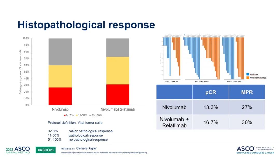 两个治疗组间的反应率相似。纳武利尤单抗单药组的pCR为 13.3%,纳武利尤单抗-relatlimab 组的pCR为 16.7%。单药治疗的主要病理反应率(MPR)为 27%,联合治疗组为 30%。