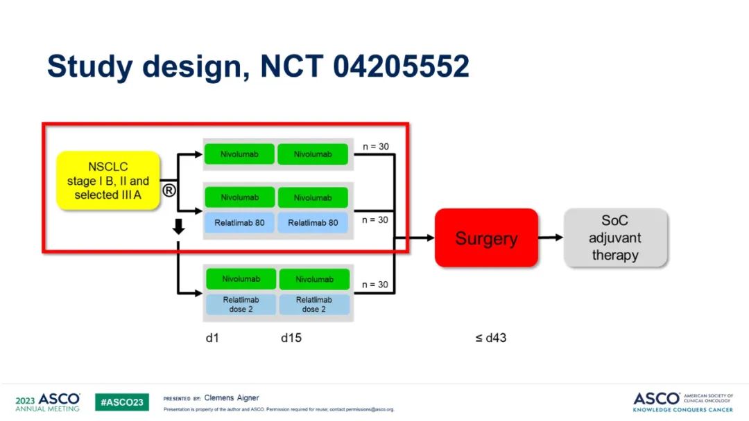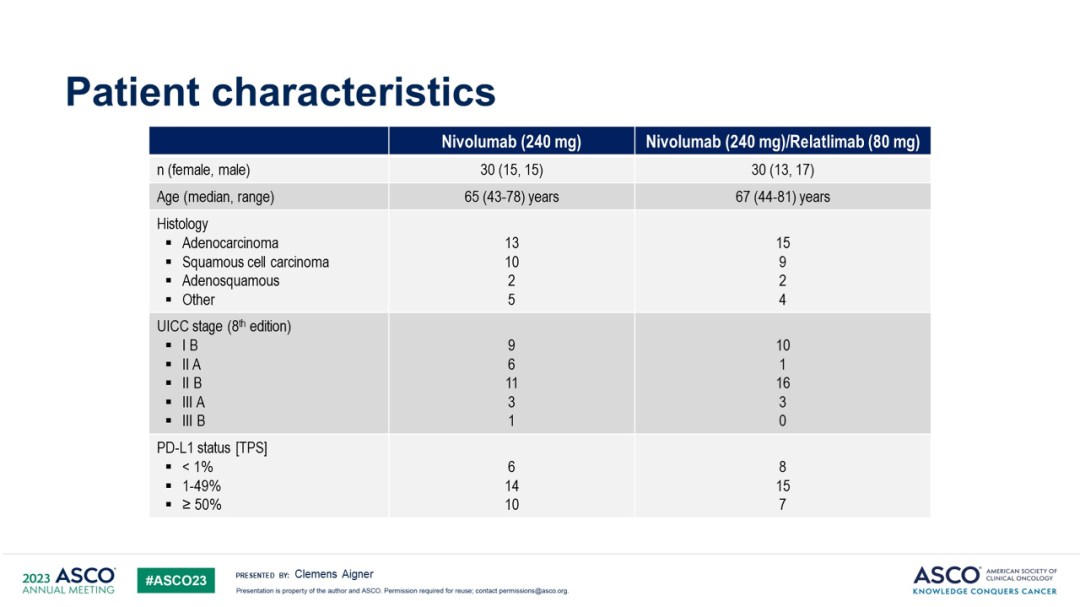 使用纳武利尤单抗加 relatlimab 治疗后的NSCLC根治性手术与单独使用纳武利尤单抗后的手术一样安全。纳武利尤单抗加relatlimab的围手术期病程、并发症发生率以及死亡率与其他新辅助治疗方案相当,标准辅助治疗可以安全实施,相关生物标志物分析正在进行中。