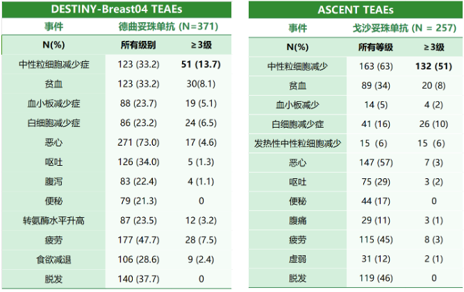 在安全性方面:T-DXd与SG的主要不良反应均为血液学毒性。在DESTINY-Breast04研究中,T-DXd≥3级的中性粒细胞减少发生率为13.7%、贫血8.1%、血小板减少5.1%16;在ASCENT研究中,SG≥3级的中性粒细胞减少发生率为51%、贫血8.0%、血小板减少2.0%、发热性中性粒细胞减少为6%17。