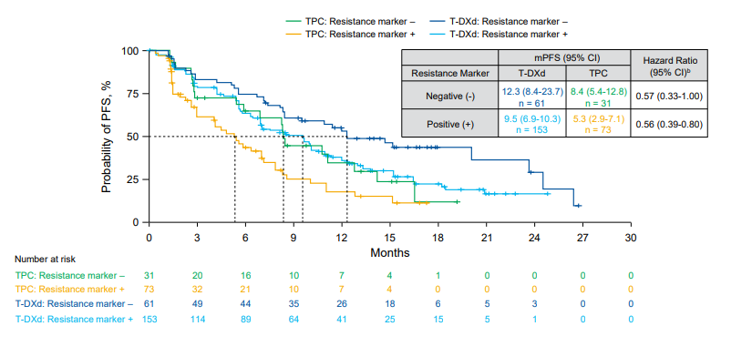对于CDK4/6i耐药患者,使用T-DXd治疗后mPFS也达9.5个月。在既往接受CDK4/6i治疗的患者中,与TPC组相比,T-DXd组的中位PFS更长,无论是否存在CDK4/6i耐药标志物[30]。