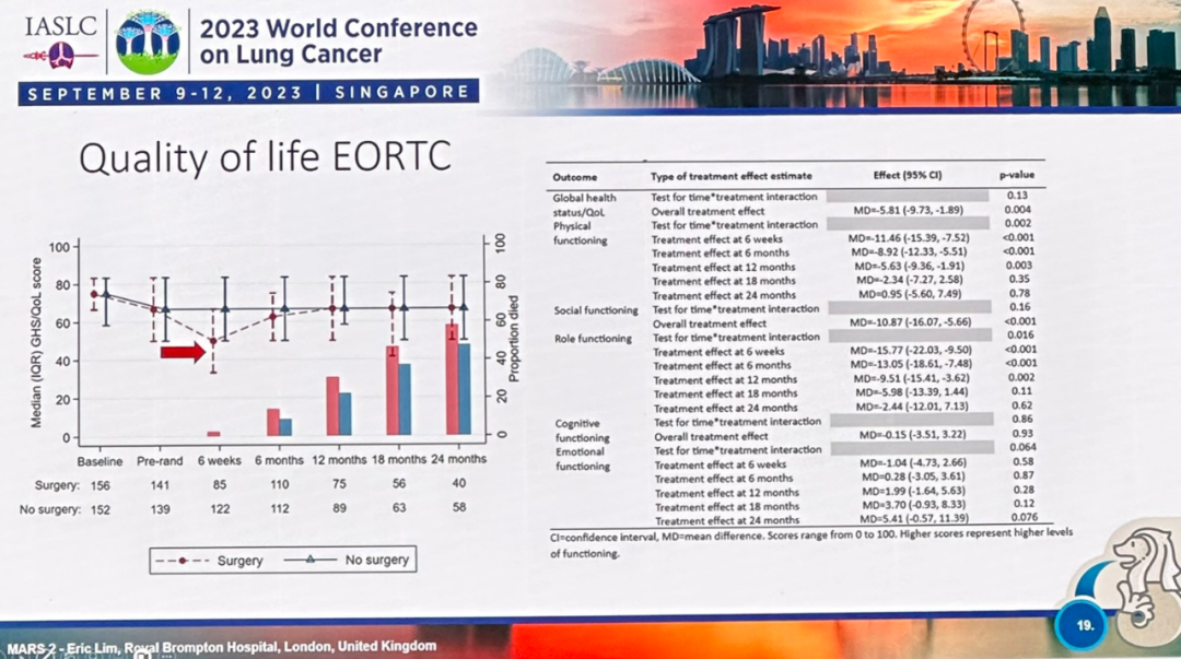 编者按:根据2023年世界肺癌大会(WCLC)发布的胸膜切除术联合化疗与单独化疗的首次直接比较结果,手术使随机后前42个月内的死亡风险增加,也导致更多的严重不良事件,并降低患者的中位生存期(OS)和生活质量,增加医疗费用。这项英国多中心随机试验MARS 2由英国皇家布朗普顿医院Eric Lim教授的团队开展,研究了手术联合化疗vs单独化疗对间皮瘤患者的影响(摘要号PL03.10)。
