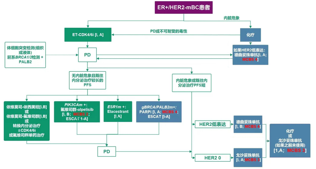 图3.2023年ESMO MBC指南在线更新的ER阳性/HER2阴性晚期乳腺癌治疗路径