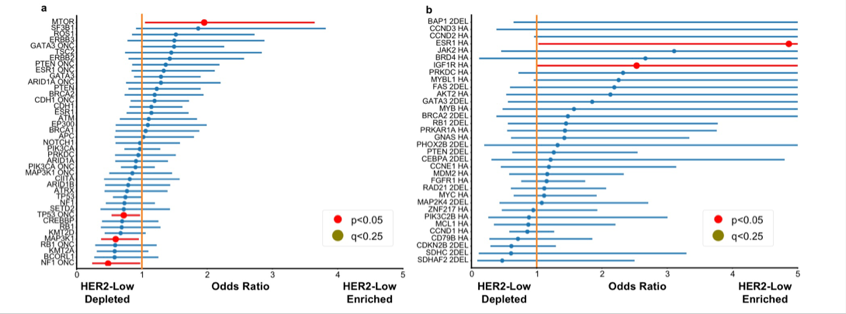 研究者对比了HER2-low和HER2-0的基因组图谱。Logistic回归用于解释背景突变或拷贝数突变率以及矫正ER状态。常见突变(在HER2-0或HER2-low样本中均&gt;4%)分析显示,在HER2-low样本中主要为MTOR突变(比值比[OR]=1.95;95%CI,1.04-3.64;p=0.04),在HER2-0样本中则主要包括MAP3K1突变(OR=0.59;95%CI,0.40-1.00,p=0.03)、NF1致癌突变(OR=0.48;95%CI:0.24-0.97;p=0.04)、TP53致癌突变(OR=0.72;95%CI,0.53–0.97;p=0.03)。然而经矫正的多重假设检验分析显示,HER2-low和HER2-0之间的基因突变分布没有差异。在致癌CNV分析方面,仅显示HER2-low中ESR1扩增(OR=4.89,95%CI 1.02–23.13,p=0.05)和IGF1R扩增(OR=2.539,95%CI 1.00–6.40,p=0.05)富集,HER2-low和HER2-0中的致癌CNV并未改变(图4)。