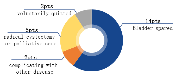 本次报告中报道了截至目前试验计划纳入的30例患者,已成功入组27例,其中17例患者已完成全部治疗周期。在这17例患者中,14例在疗程结束后达到pT0(60.8%)并进入随访观察期,且未进行根治性手术治疗。目前,其中3例保留膀胱患者已随访超过1年,未观察到肿瘤复发。2例患者因不能耐受疲乏和胃肠道症状等药物副作用退出试验。4例患者在接受治疗后达到部分缓解,并在疾病进展后接受根治性膀胱全切。1例患者在治疗后无变化,且经过评估不适合行根治性手术,并继续接受姑息治疗。另外有2例患者因治疗期间发生脑梗以及治疗过程中检查发现直肠癌导致退出试验。综上所述,该研究结果证实替雷利珠单抗联合GC新辅助治疗是MIBC患者的保膀胱治疗选择。