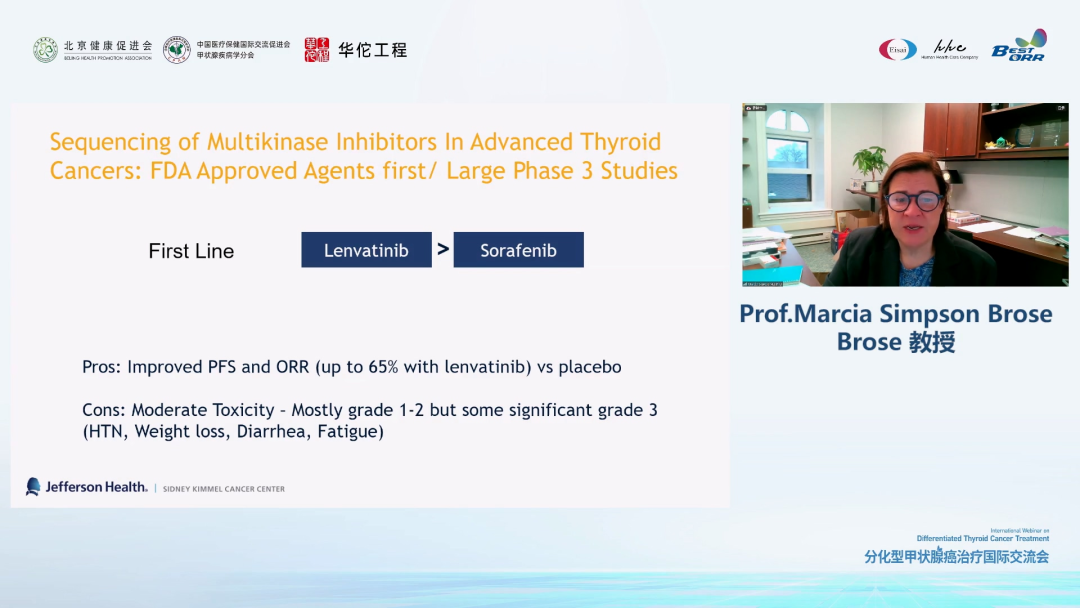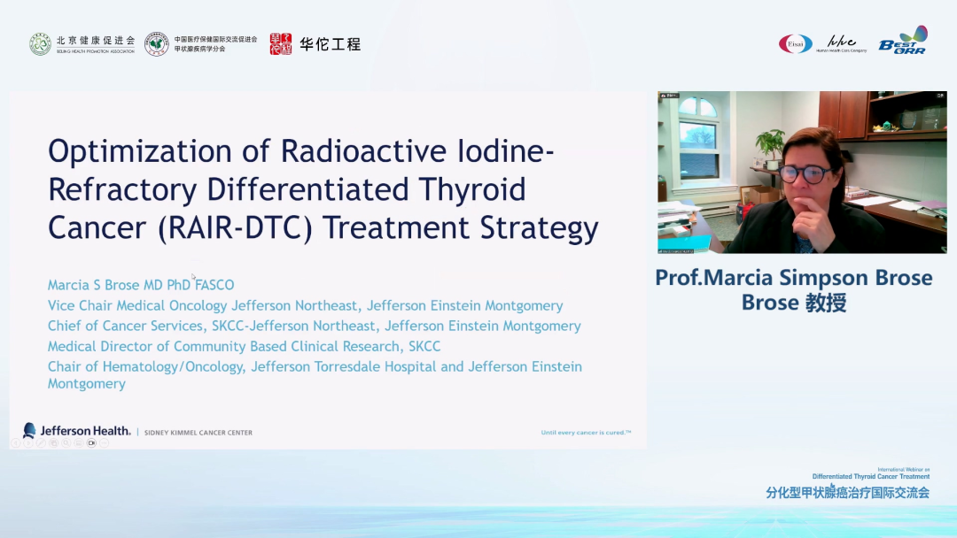 Brose教授在致辞中表示很高兴与大家分享关于分化型甲状腺癌(DTC)靶向治疗药物的相关研究和临床治疗经验。她认为在DTC治疗药物选择方面,需要多维度考虑使用时机、给药方式以及即将出现的新变化。能够参与甲状腺领域的众多研究,对她而言是医生职业生涯的宝贵体验,并期待与大家进行深入的交流和讨论。