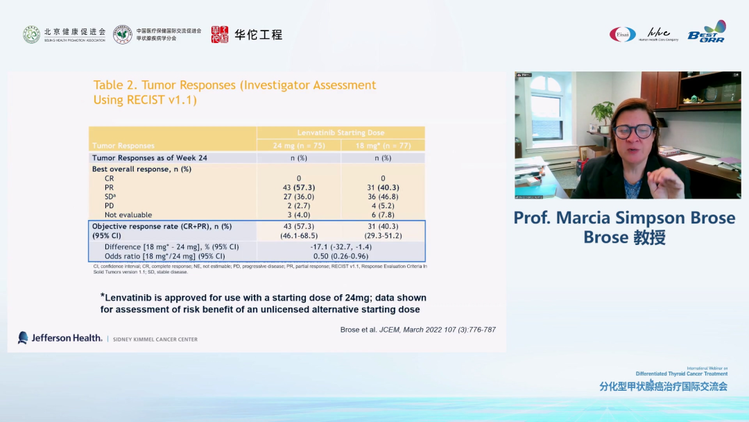 上海交通大学医学院附属仁济医院王卓颖教授主持开启了本环节的第二部分的学术分享。Brose教授围绕仑伐替尼在RAIR-DTC治疗中的剂量选择和患者管理进行了深入讲解。