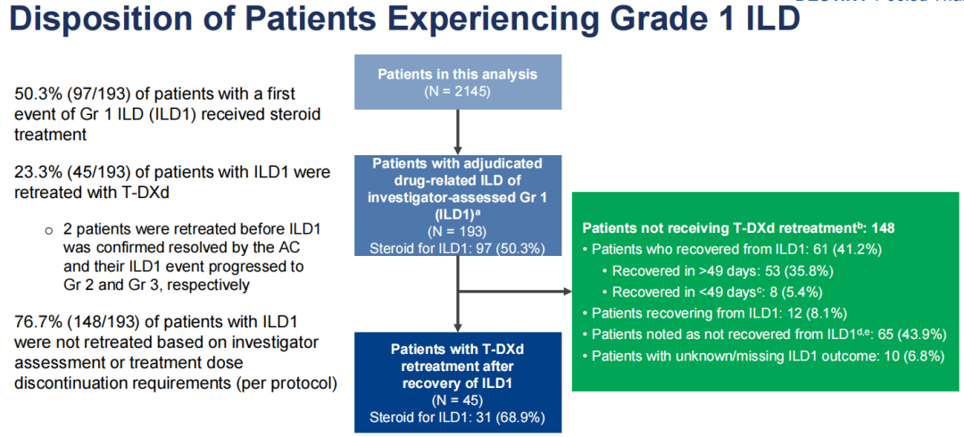 在纳入分析的2145名患者中,9.0%(193/2145)经历了Gr 1级别的fILD。在这193名患者中,有50.3%(97/193)接受了激素治疗以缓解症状。