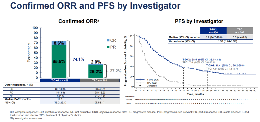 共有608名患者被随机分配(T-DXd组,n=406;TPC组,n=202)。在数据截止时,T-DXd组和TPC组的中位随访时间分别为30.2个月(0.8~60.7)和20.5个月(0.0~60.6)。