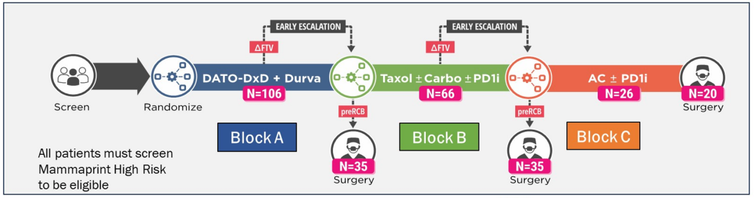 该研究中,RPS S1、S2、S3和S4这四个亚型的患者在A阶段接受Dato-DXd±度伐利尤单抗治疗,MRI随访或活检显示应答者,则可以提前手术,否则就进入B阶段强化治疗(紫衫+卡铂+PD-1抑制剂),B阶段后仍不能手术的患者则进入C阶段的挽救治疗(阿霉素+环磷酰胺±PD-1抑制剂),研究的主要终点是pCR。