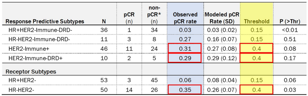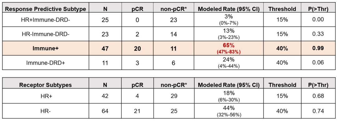 另有106例患者在A阶段接受了Dato-DXd+度伐利尤单抗联合治疗,36例患者在A阶段提前进行手术,不同分子亚型患者的疗效如下表所示,Immune+患者的pCR率最高,达43%(20/47),超过了统计学预设的阈值(40%),模型预测的pCR率则高达65%;此外,HR-患者的pCR率和预测pCR率也较高,分别为33%(21/64)和44%。