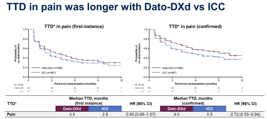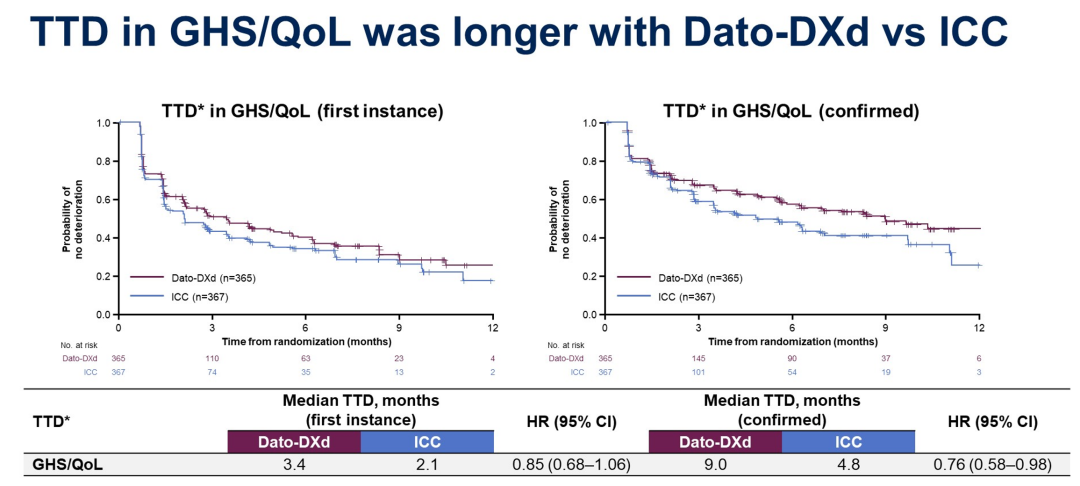 疗效和安全性的优势,使得Dato-DXd在生存获益的同时,也带来了生活质量的改善,本次ASCO大会报道了该研究的PRO结果:在中位至首次恶化时间(TTD)的初步分析(First instance)中,Dato-DXd组患者的整体健康状况/生活质量(GHS/QoL)(3.4 vs 2.1个月,HR 0.85)、躯体功能(5.6 vs 3.5个月,HR 0.77)、疼痛(3.5 vs 2.8个月,HR 0.85)的中位TTD均有改善趋势;在确认TTD的分析中,GHS/QoL(9.0 vs 4.8个月,HR 0.76),躯体功能(12.5 vs 6.2个月,HR 0.77)、疼痛(9.0 vs 5.5个月,HR 0.72)的中位TTD改善趋势更大。