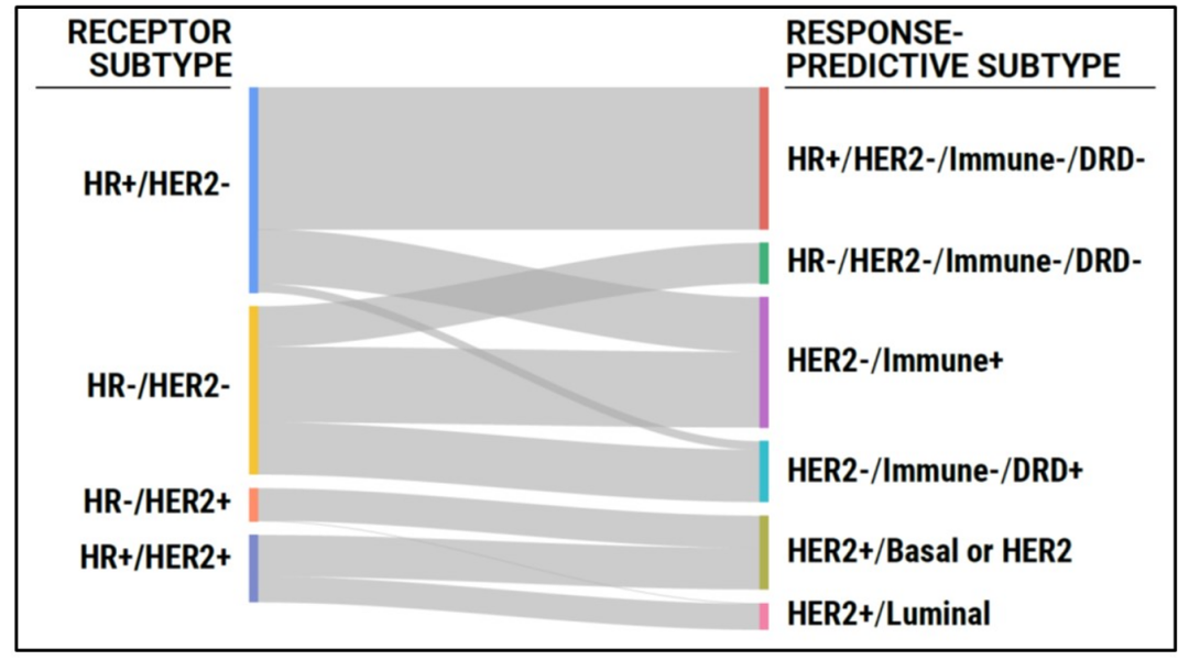 陈益定教授:I-SPY2.2是一个多中心、2期平台序贯多分配随机试验(SMART),旨在于乳腺癌新辅助治疗中快速发现较标准治疗方案更为高效的新药或联合治疗方案。研究人员根据两个阶段的治疗测试,来确定能够带来病理完全缓解(pCR)的最佳方案或者能够判断疗效的预测亚型(RPS),这里的RPS主要根据免疫表达、DNA修复缺陷(DRD)、管腔标志物以及HR和HER2状态,分为:S1(HR+/HER2-/Immune-/DRD-)、S2(HR-/HER2-/Immune-/DRD-)、S3(HER2-/Immune+)、S4(HER2-/Immune-/DRD+)、S5(HER2+/非管腔)、S6(HER2+/管腔),其中的S3和S4携带免疫标志物或者DRD基因。