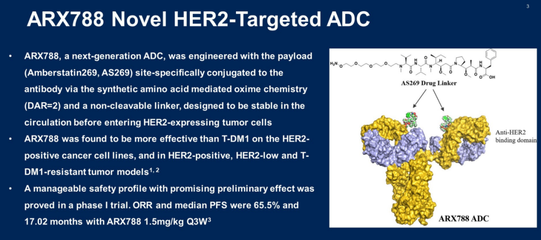 胡夕春教授:ARX788是一款精心设计的抗体偶联药物(ADC),其独特之处在于它能够通过抗原与抗体的特异性结合,利用全身的血液循环系统,精准地将药物输送至肿瘤细胞内部,以达到高效杀灭肿瘤细胞的目的。在研发ADC药物时,一个关键挑战在于如何在血液循环中保持药物的稳定性,从而减少可能引发的对造血系统、胃肠系统等的不良影响。为了应对这一挑战,ARX788采用了创新的专利技术,即在抗体的两个重链特定位置添加人工合成的氨基酸,即利用非天然氨基酸定点偶联技术使载药AS269(微管抑制剂)与HER2单克隆抗体结合。这种设计确保了每个抗体能够稳定地携带两个小分子药物,使药物抗体比(DAR)保持较为恒定的2:1,从而降低了载药脱靶及其潜在毒性,进一步增强了治疗的安全性。