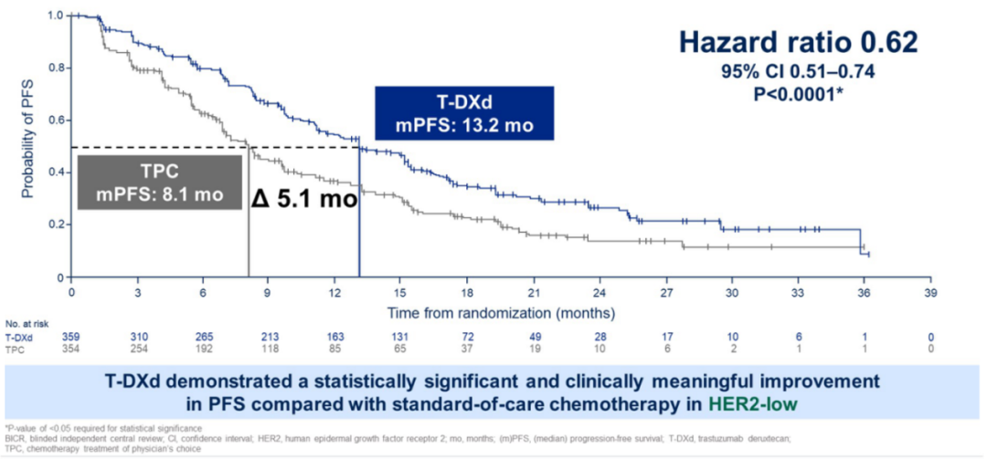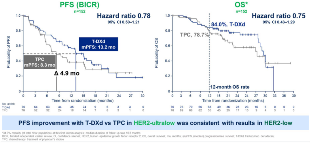 HER2低表达理念越来越受到临床关注,对于前面提到的ARX788,我们也正在通过临床试验评估其对HER2低表达患者的疗效。在DB-06临床试验中,T-DXd对HER2低表达和超低表达的患者显示出了令人惊艳的治疗效果。其有效率超过了传统治疗方法,中位PFS(无进展生存期)达到了13.2个月。这一结果有望改变我们的临床实践,成为内分泌治疗一线失败后患者的重要治疗选择。虽然目前T-DXd在国内外尚未获批HER2超低(IHC 0~1+)表达的治疗,但已经获批HER2低表达(1+和2+)的患者;而这次DB-06研究将其进一步拓展至化疗前的应用,无疑为我们提供了新的治疗策略。对于这类患者,当需要考虑使用化疗时,T-DXd应作为首选的推荐药物。