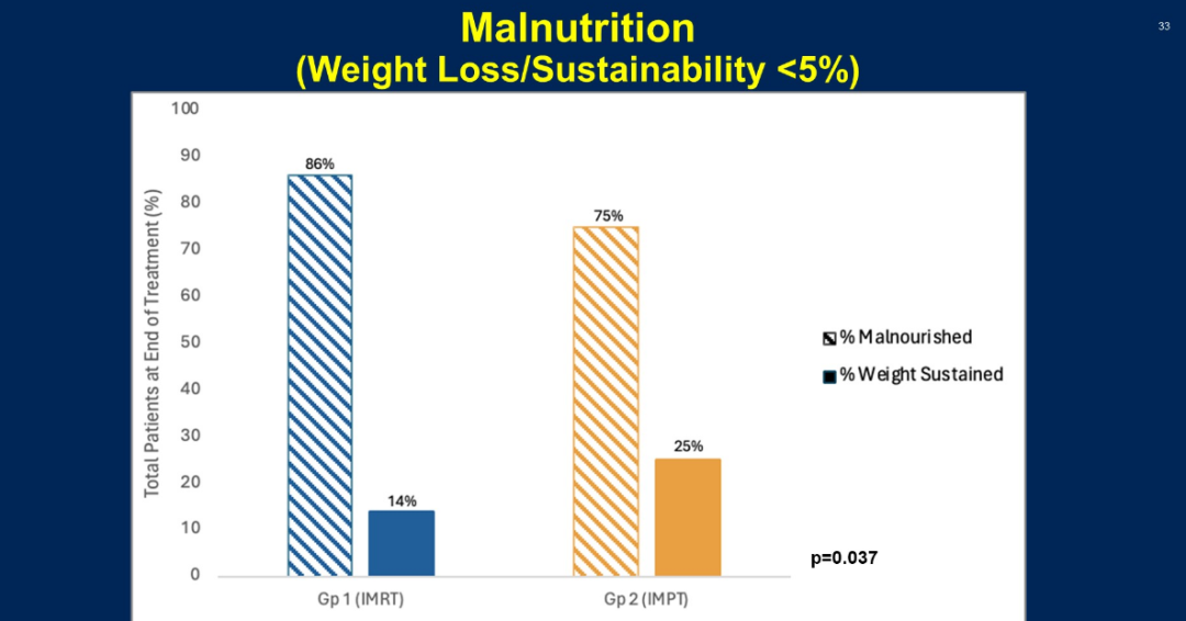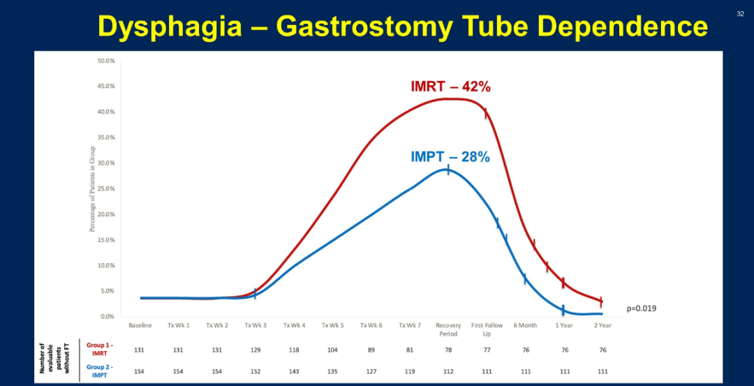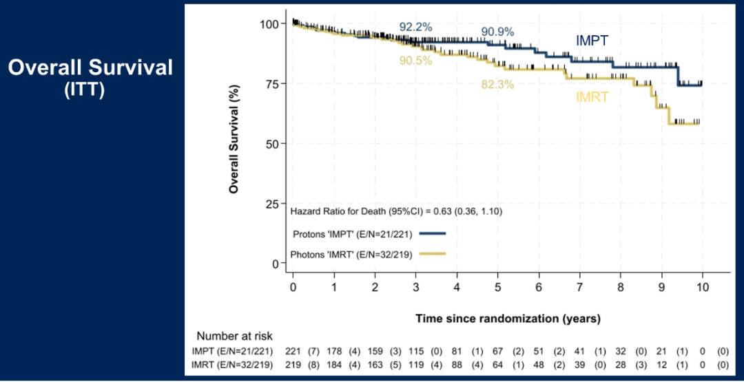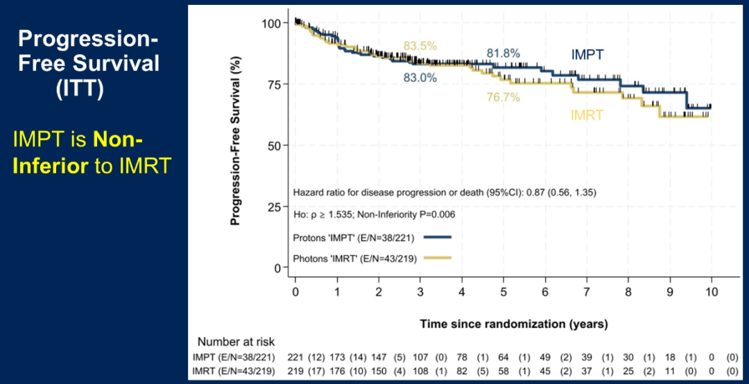 2024年ASCO大会报道的一项来自美国的大型3期临床试验(摘要号:6006),对比了调强质子疗法(IMPT)与调强光子疗法(IMRT)治疗Ⅲ-Ⅳ期头颈口咽癌(OPC)的疗效和安全性,结果显示二者达到PFS非劣效,总生存也有获益趋势,而且IMPT表现了更好的安全性和生活质量,能够减少胃造瘘管依赖和营养不良等情况发生。