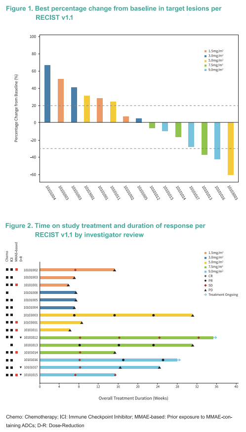 尤其值得关注的是,最新数据显示,≥5.0 mg/m²剂量组中,既往未接受过MMAE类药物治疗的UC患者(n=5)中显示出积极的疗效信号:4例达到PR,1例为SD,ORR达80%,DCR达100%。
