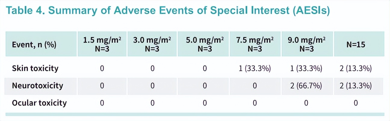 本研究的AESI包括神经毒性、皮肤毒性和眼毒性。其中,神经毒性和皮肤毒性发生率低,未见≥3级事件,暂未观察到眼部毒性。